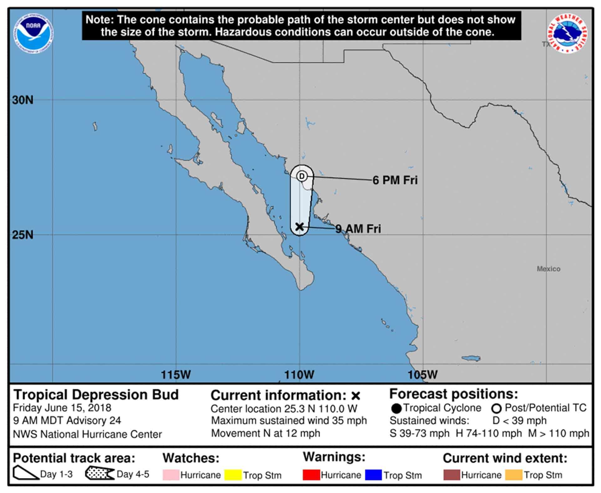 Se espera que el centro de Bud se mueva hacia el sur por el sur de Sonora para esta noche.