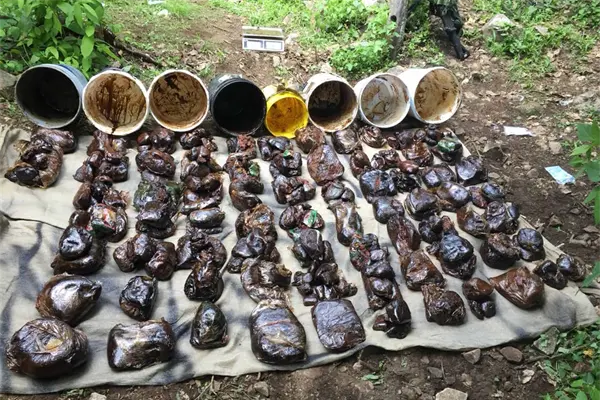 Badiraguato, Sin.- Personal militar que se encontraba realizando reconocimientos terrestres al sur de Tameapa, localizaron un centro de acopio de goma de opio en el que había 139 kilos de dicho alcaloide, además de 750 gramos de heroína y diversos químicos.