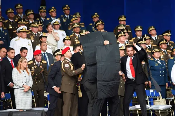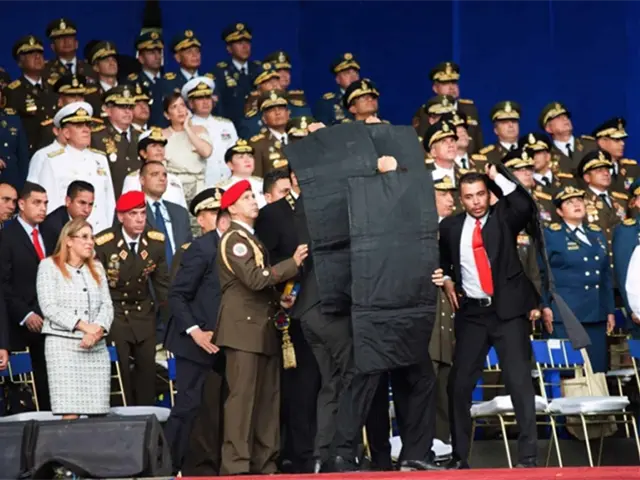 De fondo se escucha el discurso del presidente de Venezuela, quien fue evacuado del lugar momentos después.