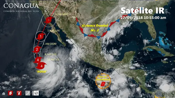 Ciudad de México.- Esta mañana, el huracán Rosa de categoría 4, se localizó a mil 20 kilómetros al suroeste de Cabo San Lucas, Baja California Sur, informó el Servicio Meteorológico Nacional (SMN).