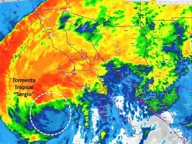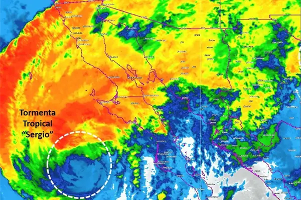 La Tormenta Tropical "SERGIO" continúa desplazándose a 37 km/h hacia Baja California Sur, A 400 km al oeste-suroeste de Cabo San Lázaro, B.C.S., con vientos de 95 km/h y rachas de 110 km/h, su nubosidad favorece el potencial de tormentas muy fuertes a intensas en la Península de Baja California, así como tormentas puntuales fuertes en Sonora y Chihuahua, pudiendo tocar tierra en la península de Baja California, la noche del jueves 11 o la madrugada del viernes 12.