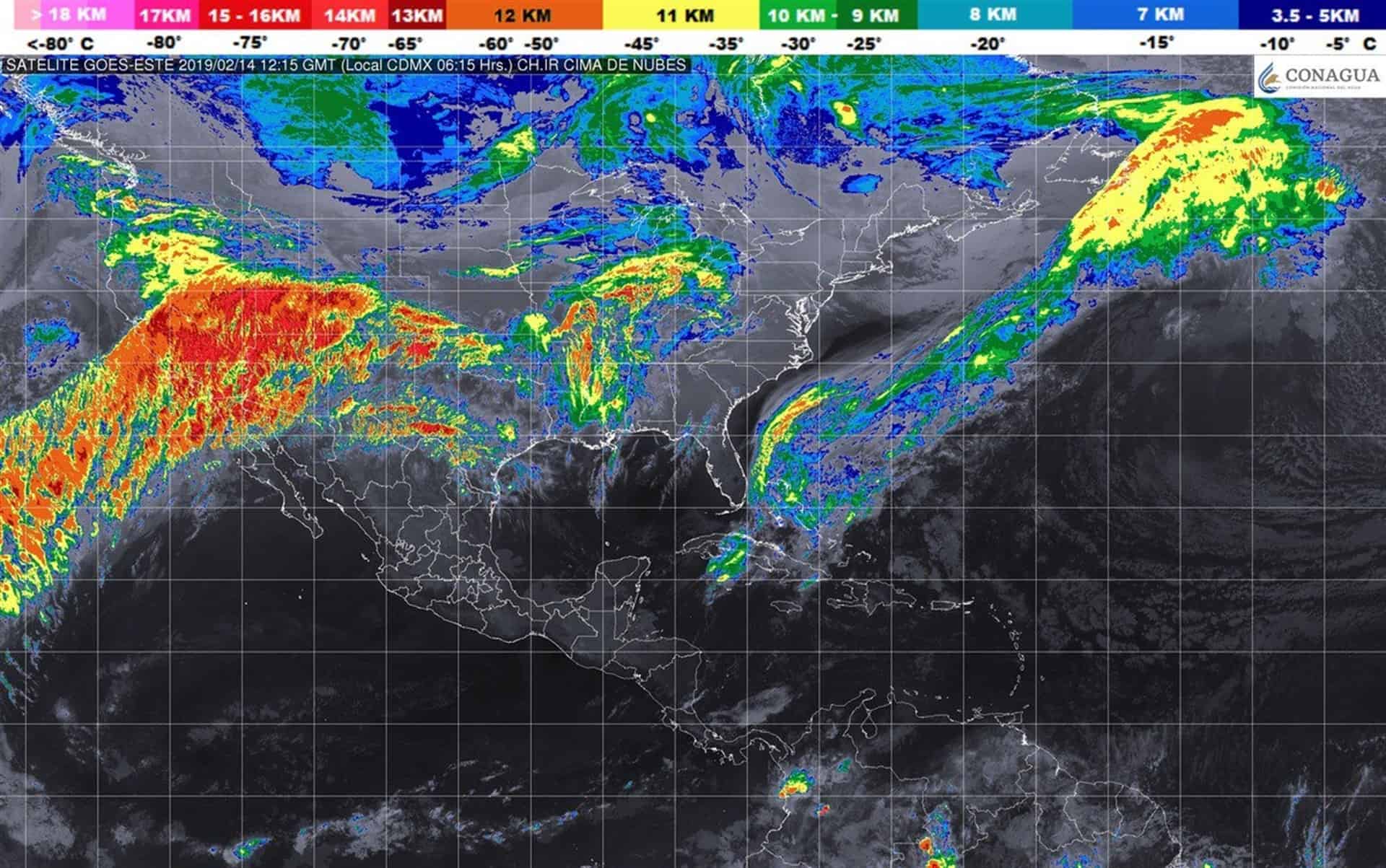 En el reporte más reciente del organismo dependiente de la Comisión Nacional del Agua (Conagua), también pronosticó que la aproximación de un nuevo frente frío en combinación con el fuerte ingreso de humedad ocasionado por la corriente en chorro originará potencial de tormentas muy fuertes a puntuales intensas en Baja California y Sonora; posible caída de nieve o aguanieve en zonas montañosas de Baja California, Sonora y Chihuahua.