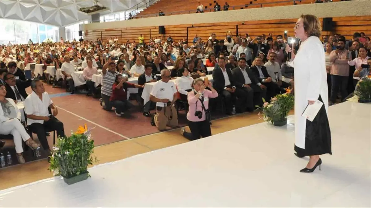 En la reunión, que se llevó a cabo en el Deportivo Plan Sexenal de la Ciudad de México, Elba Esther advirtió que va a “sacar de su casa a aquellos que ayer los pusieron de rodillas”.