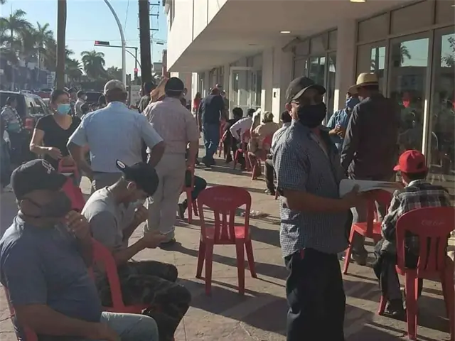 Los Mochis, Sin.- Pese a la recomendación del Instituto Mexicano del Seguro Social a guardar la distancia y evitar que los adultos mayores acudan a cobrar su pensión a las instituciones bancarias, esto no se respeta y los bancos lucen abarrotados en su exterior.