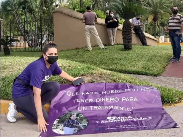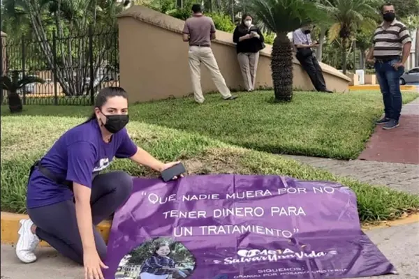 Aunque entregaron cartas con la misma solicitud en los diversos módulos de recepción para el Presidente de la República, Jazmín se encuentra en la banqueta del hotel con una pancarta con la leyenda “Que nadie muera por no tener dinero para un tratamiento”.