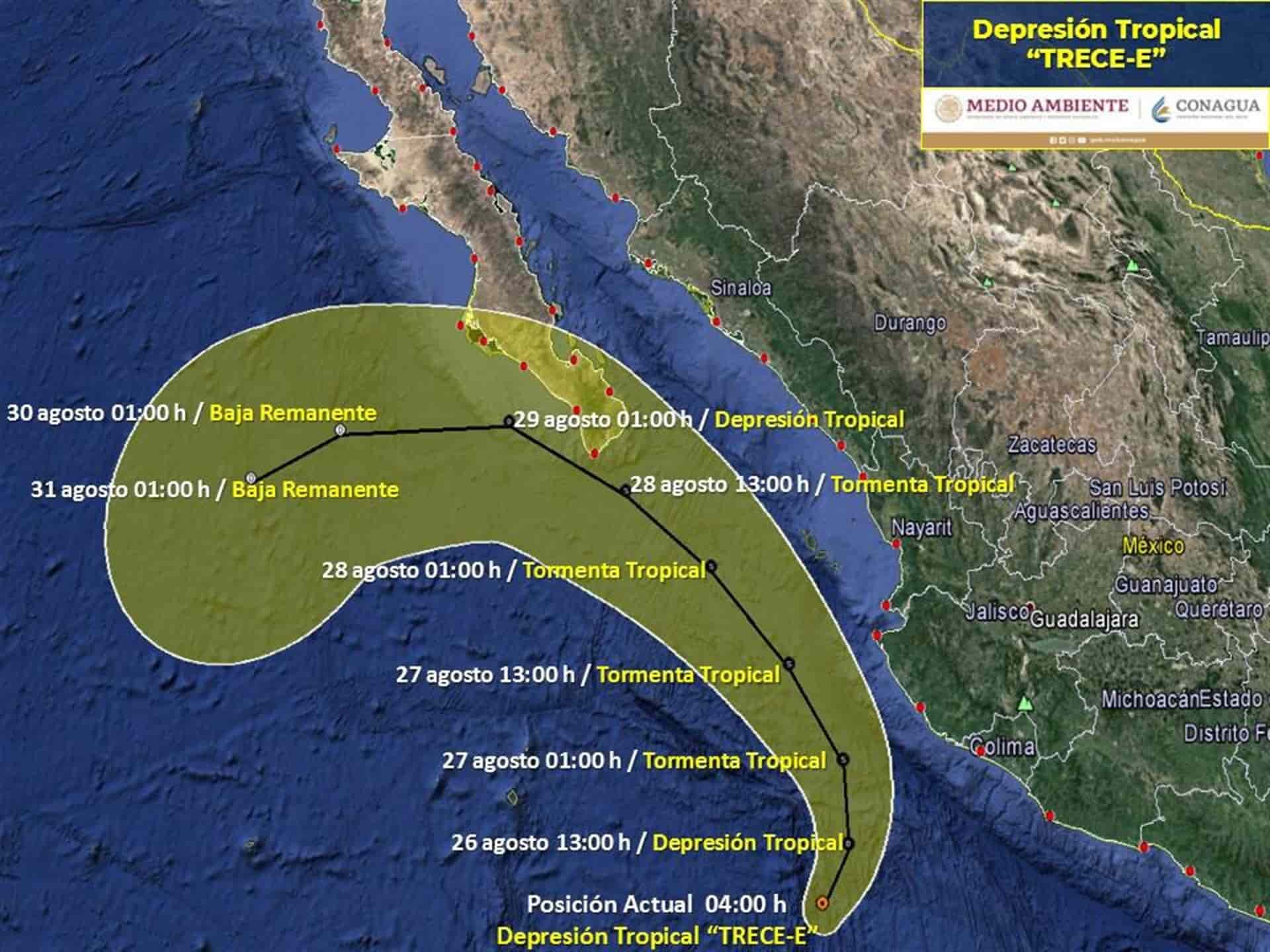 Culiacán, Sin.- Se ha formado la Depresión Tropical “Trece-E” al suroeste de las costas de Jalisco, su centro se localiza a 255 km al sur-suroeste de Playa Pérula, Jal., y a 275 km al oeste-suroeste de Manzanillo, Col. Presenta vientos máximos sostenidos de 55 km/h y rachas de 75 km/h y desplazamiento hacia el nor-noroeste a 7km/h.