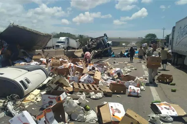 Mazatlán, Sin.- Tres tractocamiones protagonizaron un aparatoso accidente sobre la carretera Mazatlán-Culiacán; por fortuna el percance no cobró vidas humanas y solo dejó cuantiosos daños materiales así como pérdidas millonarias en mercancías.