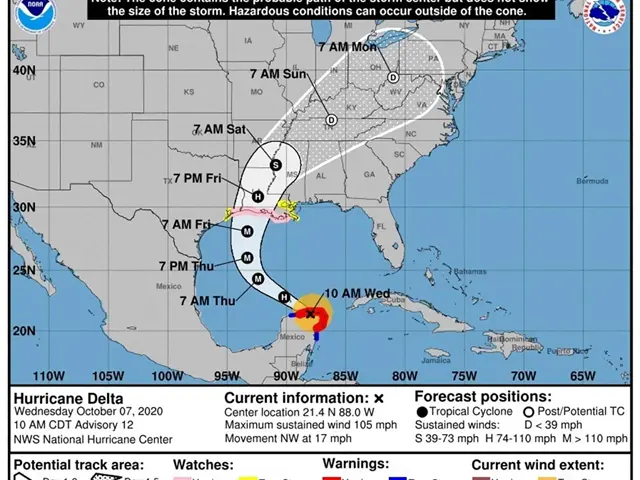 A las 8 am EST Delta, con vientos máximos sostenidos de 100 millas por hora (155 km/h), se encontraba en la parte sur del Golfo de México, a 425 millas (685 km) al sur de Cameron (Louisiana).