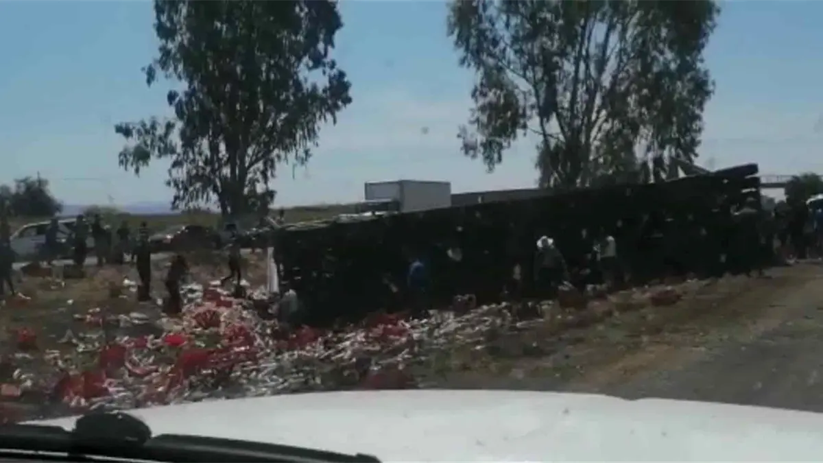 Culiacán, Sin.- Un camión de doble remolque que trasportaba miles de litros de bebidas gasificadas se volcó este domingo cuando circulaba sobre la carretera que conduce de Mazatlán a Culiacán.
