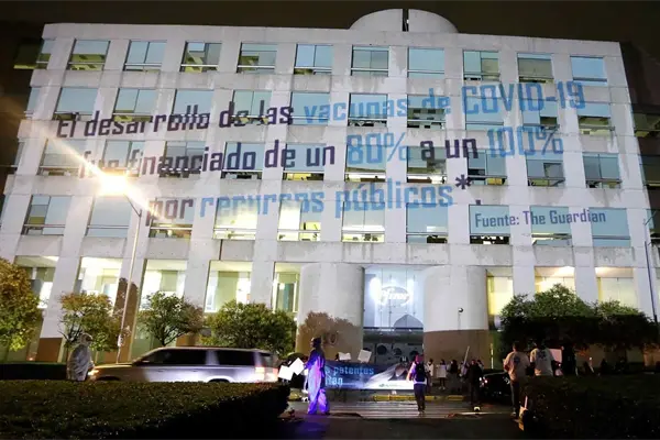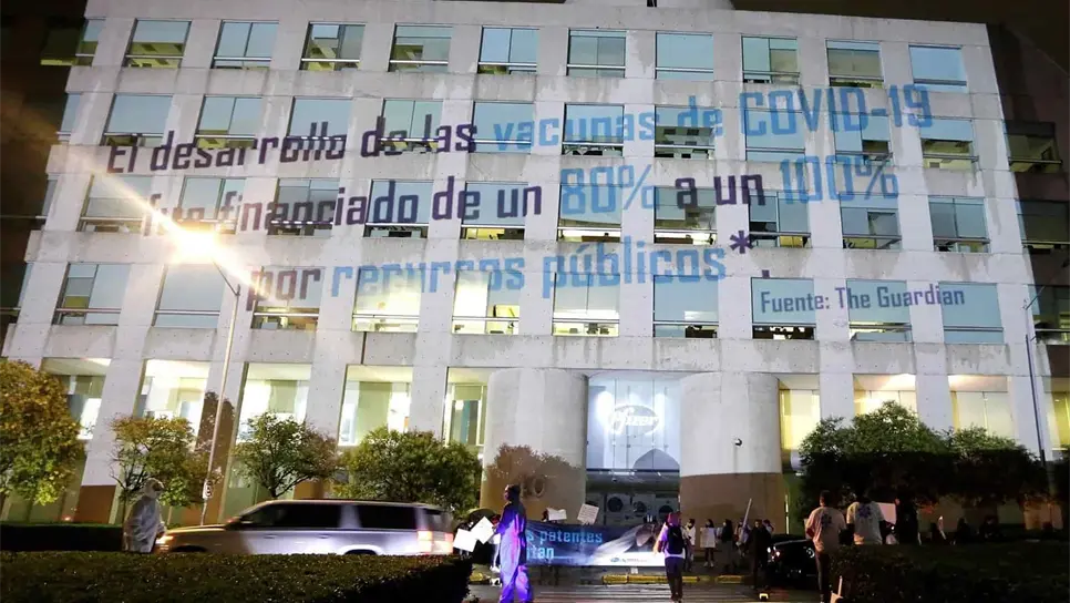"Las vacunas contra el Covid-19 deben ser un bien público de la humanidad ¡Liberen las patentes!", fue una de las frases que la organización proyectó con un haz de luz sobre el edificio de la empresa en el poniente de la capital mexicana.