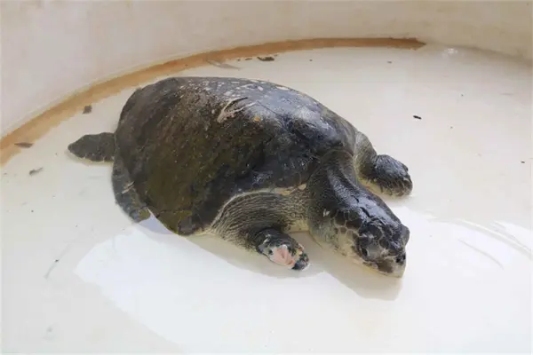 El ejemplar presenta severos golpes en cabeza y caparazón, además de que le fueron cercenadas sus aletas delanteras (cicatrices hechas aproximadamente hace 2 meses y que aún no sanan al 100%). Ingresó deshidratado, con parásitos, movimientos torpes y desorientado.