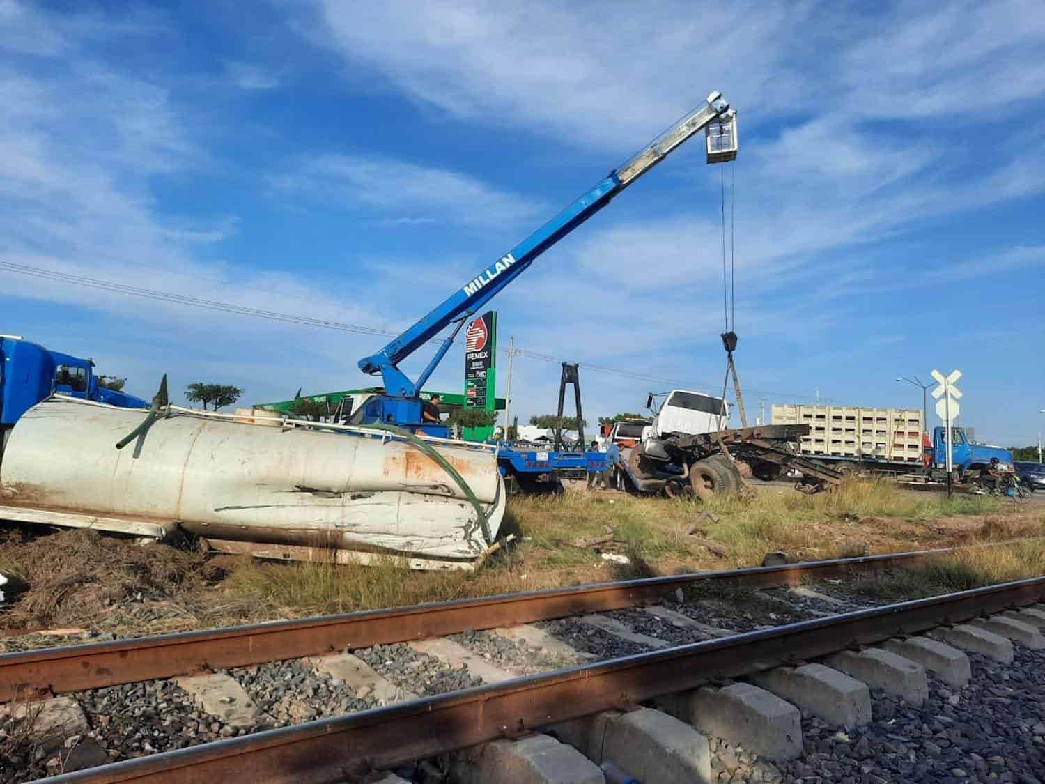 El conductor de una pipa resultó con golpes en el rostro y en diferentes partes del cuerpo tras ser embestido cuando intentó ganarle el paso al tren, en el municipio de La Cruz de Elota.