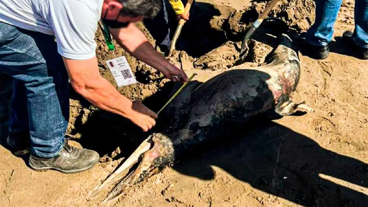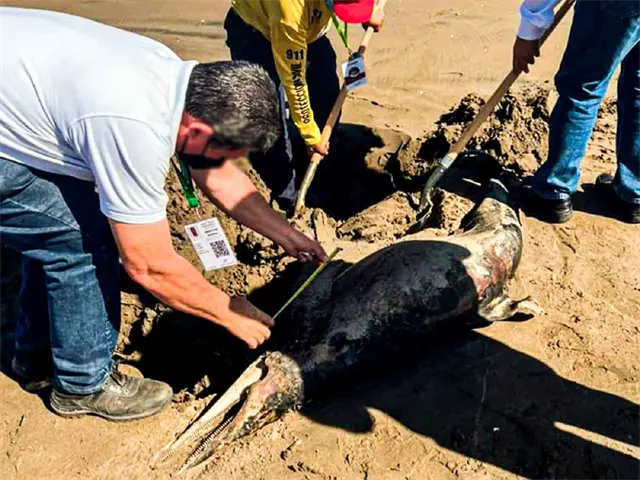 >Además de los 7 delfines, se suma la ballena que también fue localizada muerta en la costa guasavense.