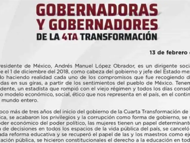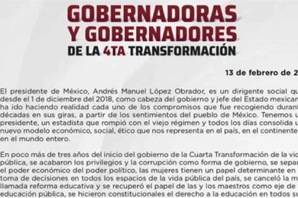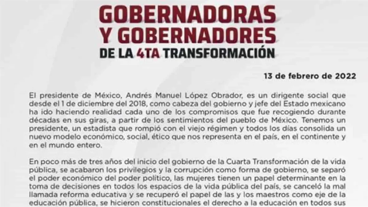El comunicado salió a la luz publica el pasado 13 de febrero y en éste los mandatarios respaldaron la iniciativa de Reforma Eléctrica, asimismo, afirmaron que los ataques contra el presidente vienen de grupos económicos que «perdieron privilegios» y se oponen a dicha reforma.