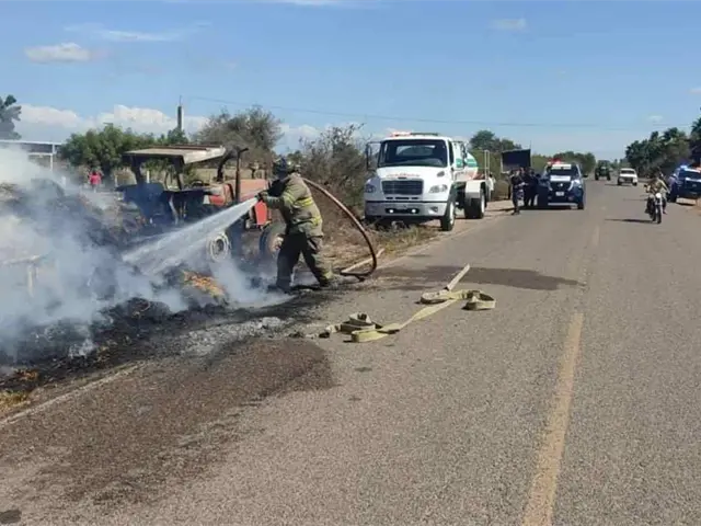 Un aparente cortocircuito registrado en el cableado de una cama baja, provocó un incendio está tarde en el municipio de Guasave, mismo que arrasó con 180 pacas de alimento para ganado y un tractor, en el que transportaban las pacas.