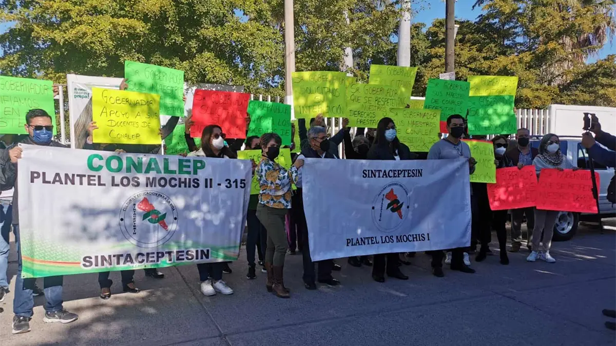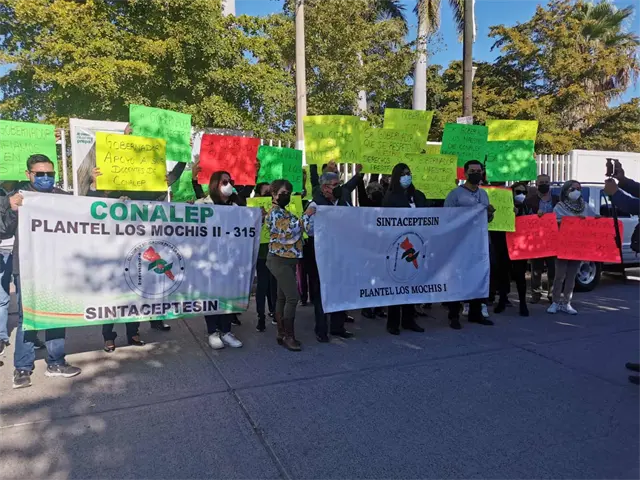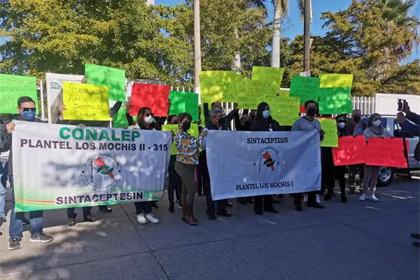 Trabajadores integrantes del SINTACEPTESIN Los Mochis se manifestaron de manera pacífica al exterior de las instalaciones de Conalep I, para solicitar al gobernador Rubén Rocha Moya intervenga directamente y de solución definitiva.