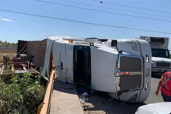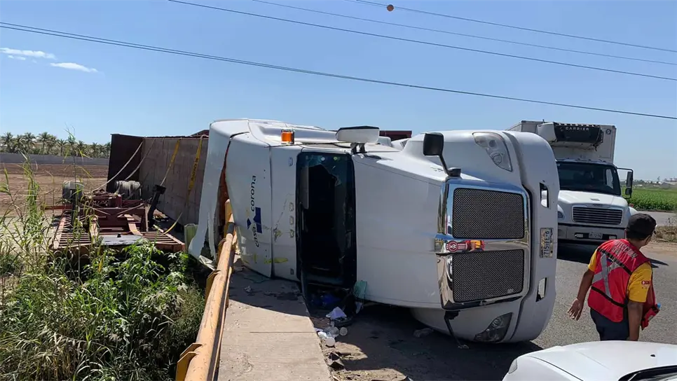 La acompañante de un operador de un tractocamión con doble plataforma resultó lesionado el mediodía de este viernes, al volcar mientras intentaba incorporarse a la carretera internacional México 15, a la altura de conocida empresa tratadora de agua y la zona conocida como «la japonesa»