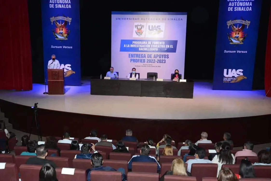 La Universidad Autónoma de Sinaloa (UAS) realizó la entrega de la primera ministración de apoyos del Programa de Fomento a la Investigación Educativa en el Bachillerato (PROFIEB) 2022-2023, recursos que se destinarán a 107 proyectos de investigación educativa que involucra a más de 400 docentes de 33 unidades académicas de preparatoria de todo el estado con recursos propios de la institución por el orden de los 5 millones 100 mil pesos.
