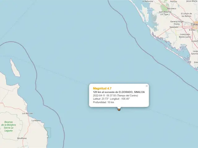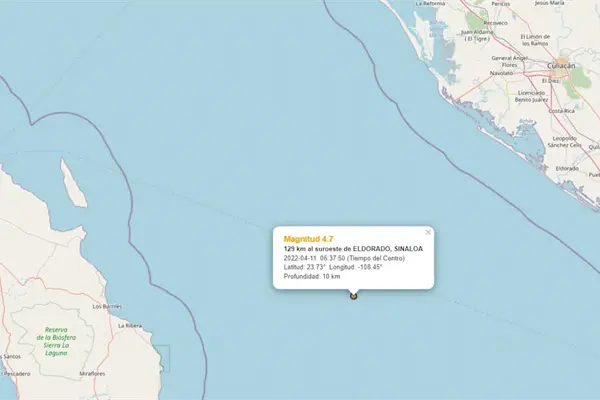 Un sismo de Magnitud 4.7 se registró esta mañana a las 6:37:50, con epicentro en la zona de Pescadero, con coordenadas geográficas 23.73°, -108.45° y a una distancia de 129 Km al suroeste de Eldorado, Culiacán, Sinaloa, a una profundidad de 10 km.