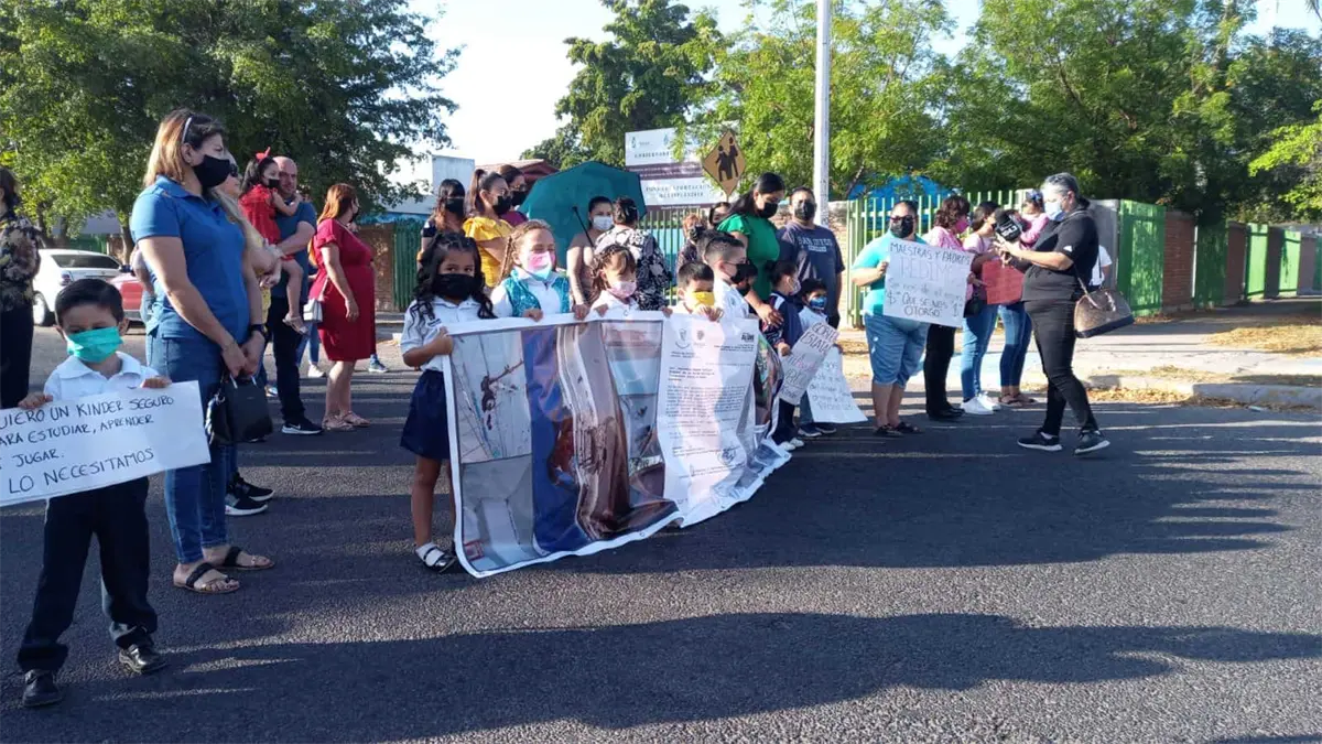 >Mamás, maestros y niños del preescolar Justo Sierra bloquearon la calle Obregón, en protesta por las malas condiciones del emblemático plantel; autoridades de SEPyC acuden y llevan promesas.