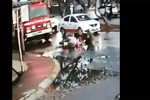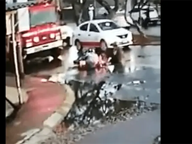 Un conductor de motocicleta fue grabado cuando intentó rebasar por la derecha a un camión de bomberos para intentar ganarle el paso, maniobra prohibida en el reglamento de Tránsito.