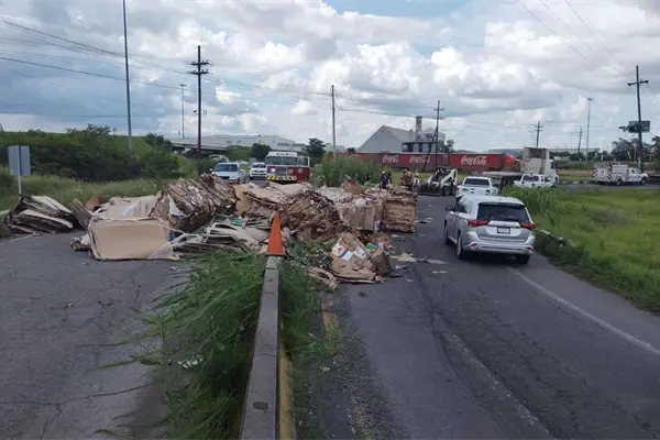 El trailer de la línea Volvo circulaba por la carretera La Costerita y al tomar una de las curvas del distribuidor vial, las toneladas de cartón que presuntamente ya iban ladeadas cayeron en medio de la vialidad.