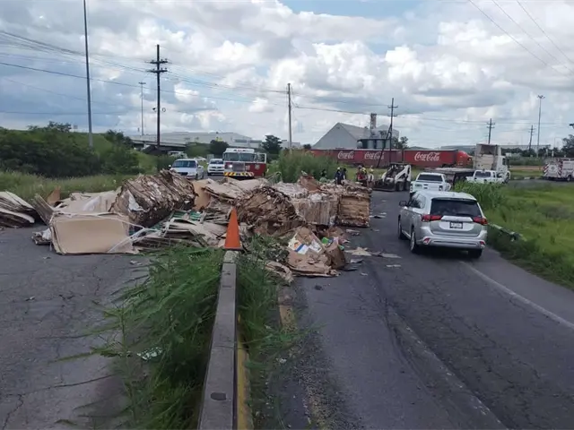 Caos vial se registró en el distribuidor vial de El Trébol de El Diez, al sur de Culiacán, tras la caída de pesadas pacas de cartón de un tráiler de plataforma, debido a que presuntamente iban mal colocadas.