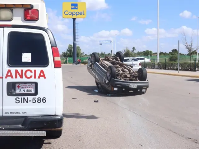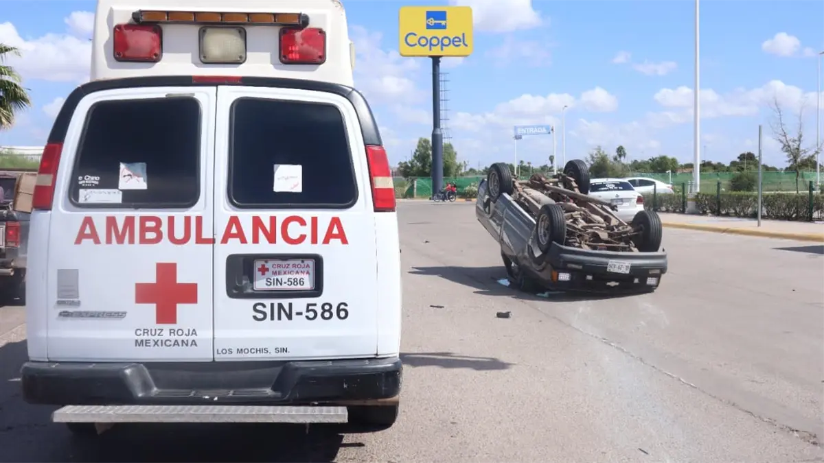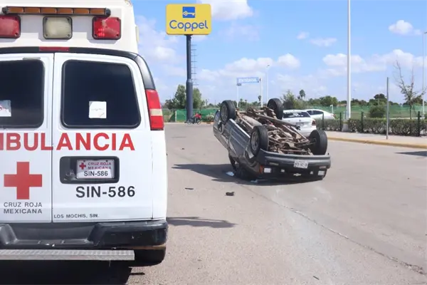 Importantes pérdidas por daños materiales en un vehículo y una camioneta, dos personas con lesiones menores, fue el saldo de un aparatoso accidente que terminó en volcadura el mediodía de este viernes, en un transitado crucero rumbo a la salida norte de la ciudad de Los Mochis.