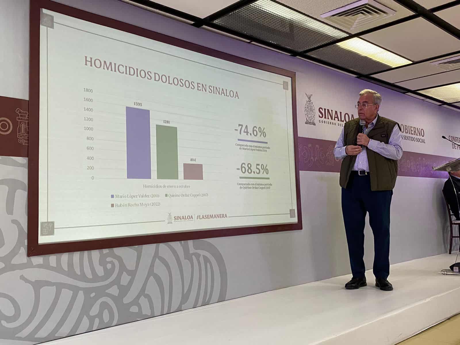 En una comparación con la administración pasada, el Gobernador detalló que en el 2021 la administración de Quirino Ordaz Coppel registró mil 281 homicidios dolosos mientras que en el primer año de su gobierno se contabilizaron 404 casos.