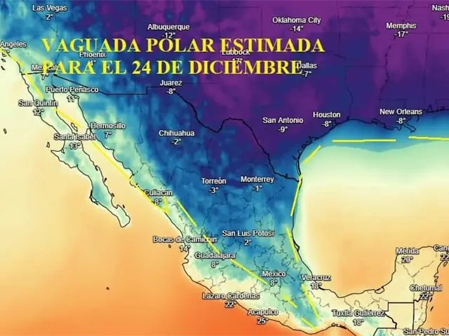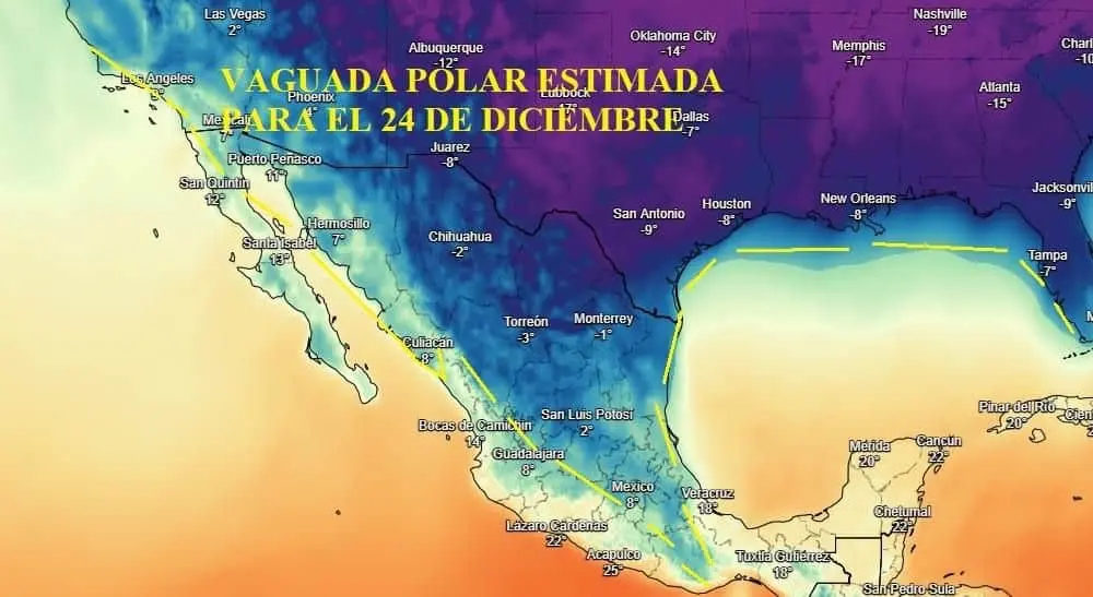 Explicó que estas bajas temperaturas los días 24 y 25 de diciembre serán provocadas por una vaguada polar y una onda gélida situada en Estados Unidos que bajará en gran parte al noroeste de México.