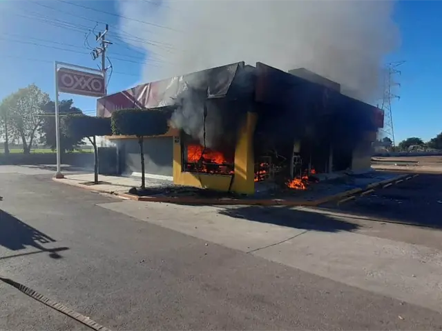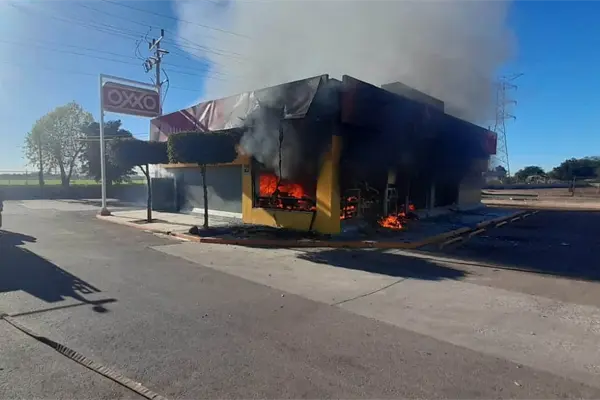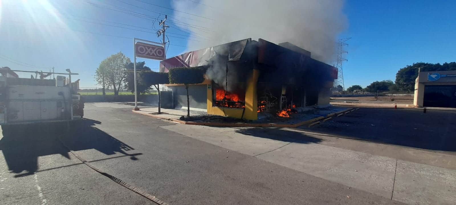 Una tienda Oxxo de Ahome, que se ubica sobre la carretera México 15, a pocos metros de la entrada a la ciudad de Los Mochis, fue incendiada por grupos armados, la mañana de este jueves, 5 de enero.