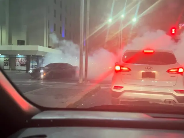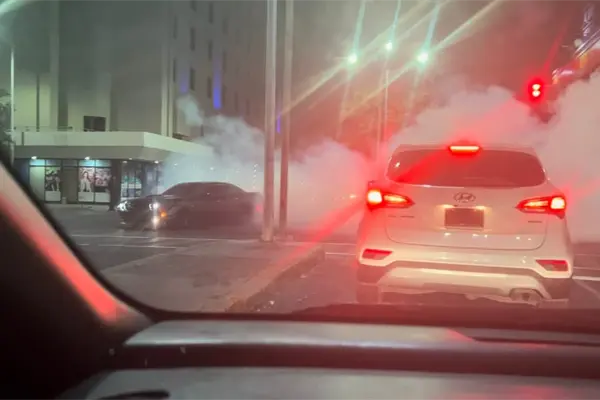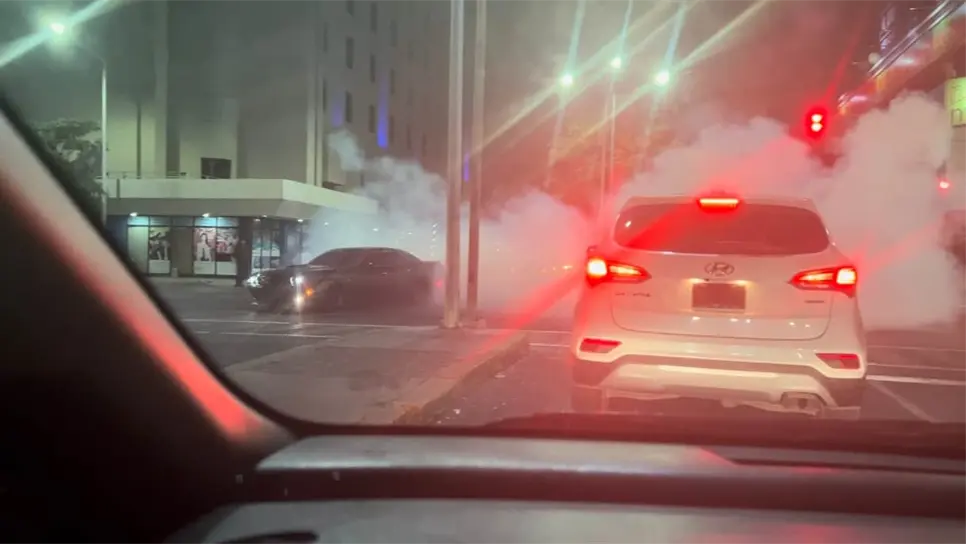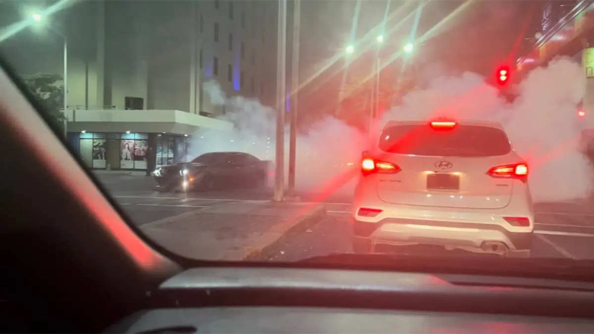 También en las imágenes se puede observar cómo mientras algunos automovilistas esperan el cambio en el semáforo para avanzar, observan la acción e incluso se quedan sin visibilidad por el humo que provocó la acción de este automovilista.