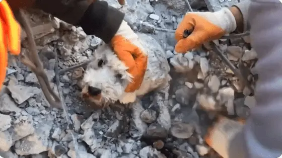 El french poodle quedó entre los escombros hasta ser encontrado por los rescatistas.
