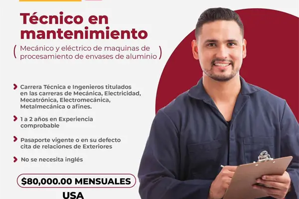Técnico en mantenimiento mecánico y eléctrico de máquinas de procesamiento de envases de aluminio ($80,000) USA