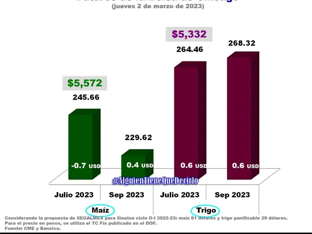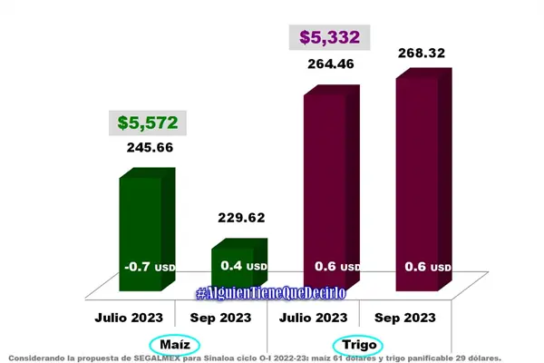 Por otra parte, los futuros de trigo a julio del 2023 ganaron 0.6 dólares para ubicarse en 264.46 dólares, lo que significa un ingreso estimado al productor de $5 mil 332 por tonelada de trigo panificable (considerando la base de 29 dólares propuesta por Segalmex).