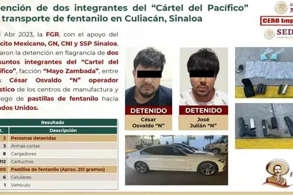 Presuntamente son integrantes de la fracción de Ismael «El Mayo» Zambada, en el Cartel de Sinaloa, los dos detenidos en Culiacán; uno de ellos operador logístico de los centros de manufactura y traslado de pastillas de fentanilo hacia Estados Unidos, dio a conocer el subsecretario de Seguridad, Luis Rodríguez Bucio, este martes durante el informe de «Cero Impunidad» en la conferencia matutina del presidente, Andrés Manuel López Obrador.