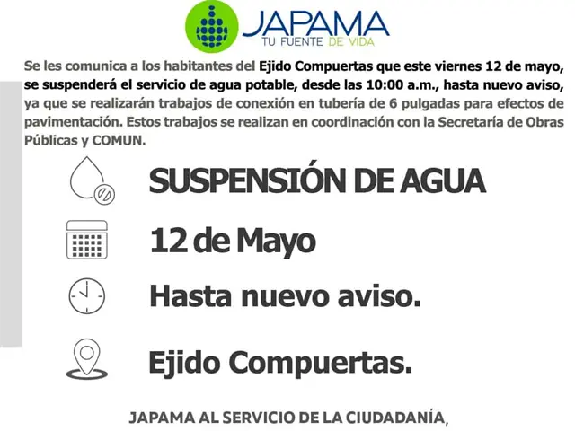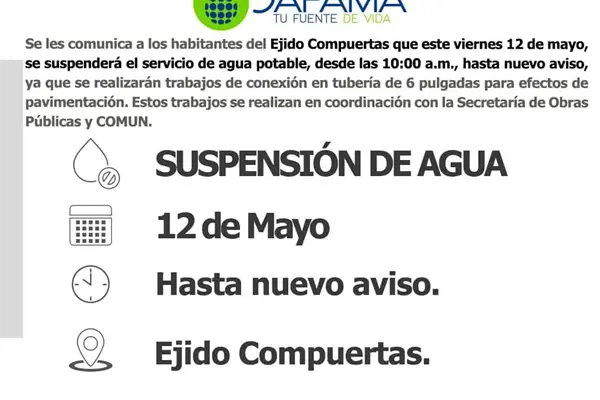 La Junta de Agua Potable y Alcantarillado del Municipio de Ahome (Japama), a través de un comunicado, dio a conocer que este viernes 12 de mayo habrá suspensión en el servicio de agua, provocando afectación a 111 colonias de Los Mochis.