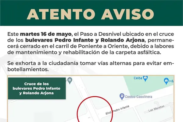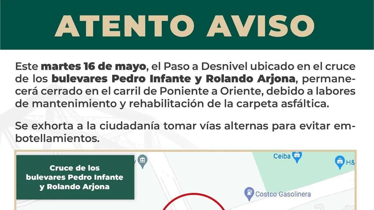 Este martes 16 de mayo permanecerá cerrado el Paso a Desnivel ubicado en el cruce de los bulevares Pedro Infante y Rolando Arjona, en Culiacán.