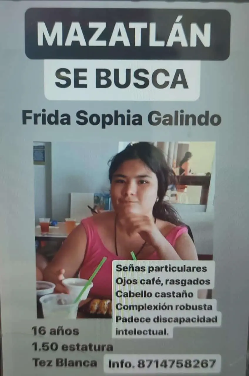 Se trata de Frida Sophia Galindo, de 16 años de edad, quien se encontraba con su familia de vacaciones en Mazatlán. Los turistas comentan que la joven habría salido de un complejo hotelero ubicado en la Zona Dorada del puerto.
