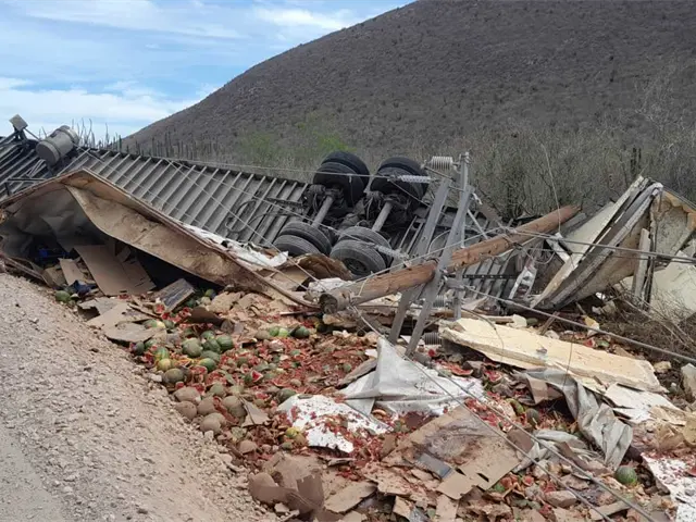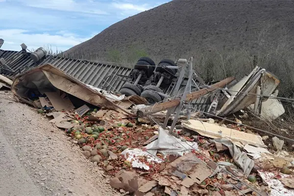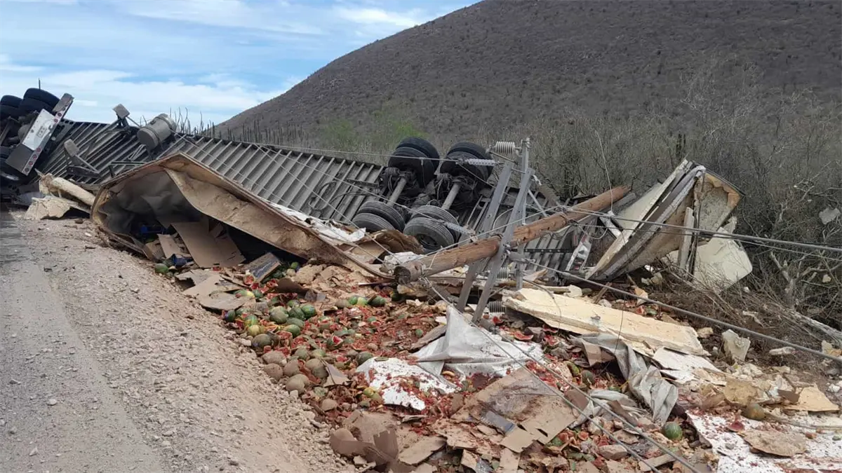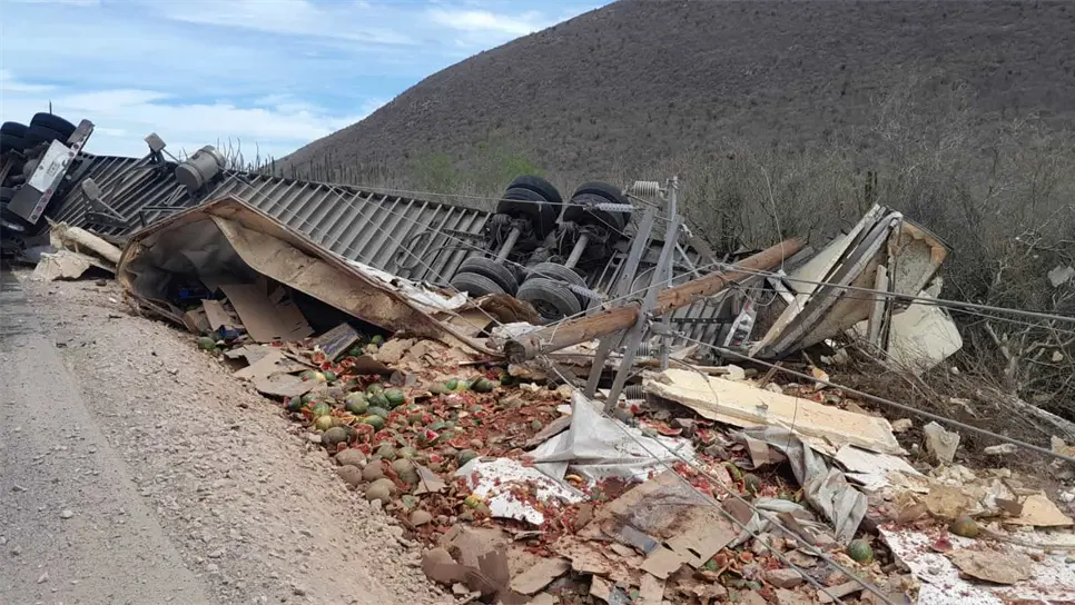 Un tráiler cargado con poco más de 20 toneladas de sandías terminó volcado y las sandías regadas, muchas de ellas partidas, a un costado de la carretera que conduce a Las Bolsas de Tosalibampo, en el municipio de Ahome.