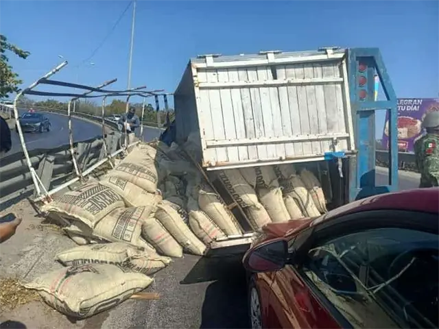 La unidad quedó acostada sobre su costado izquierdo y parte del producto, que se presume es café, quedó sobre el pavimento. Además, provocó una fuerte obstrucción en el tráfico, pues el camión volcado abarcó poco más de un carril.