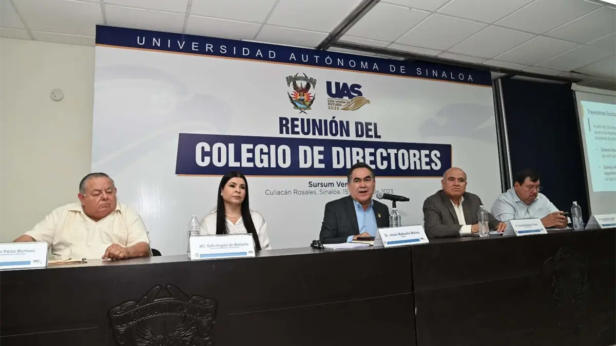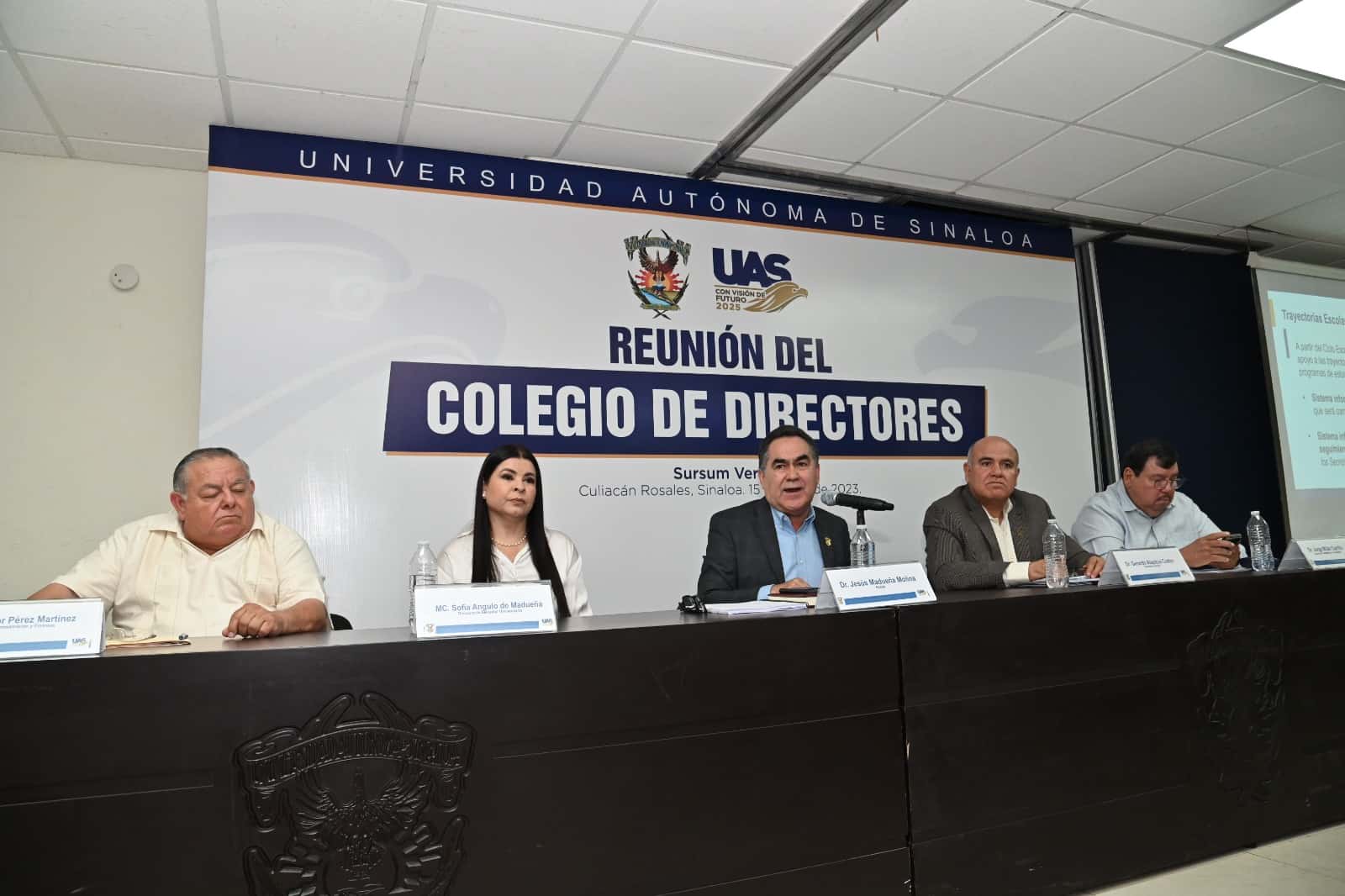 Directores de nivel medio superior y superior de la Universidad Autónoma de Sinaloa (UAS) y funcionarios de la administración central, encabezados por el Rector Jesús Madueña Molina, sostuvieron una reunión de trabajo para definir actividades en la agenda institucional y el inicio del Ciclo Escolar 2023-2024.
