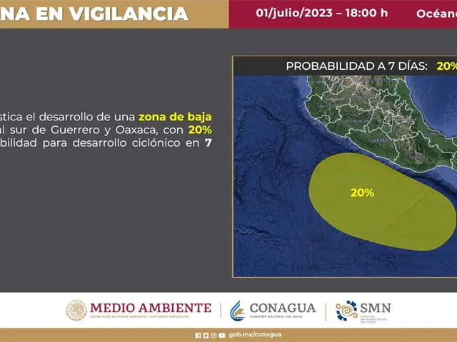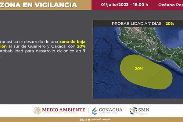El Servicio Meteorológico Nacional (SMN) de la Comisión Nacional del Agua (Conagua) pronosticó el desarrollo de una zona de baja presión al sur de Guerrero y Oaxaca, con 20 por ciento de probabilidad para desarrollo ciclónico en 7 días.