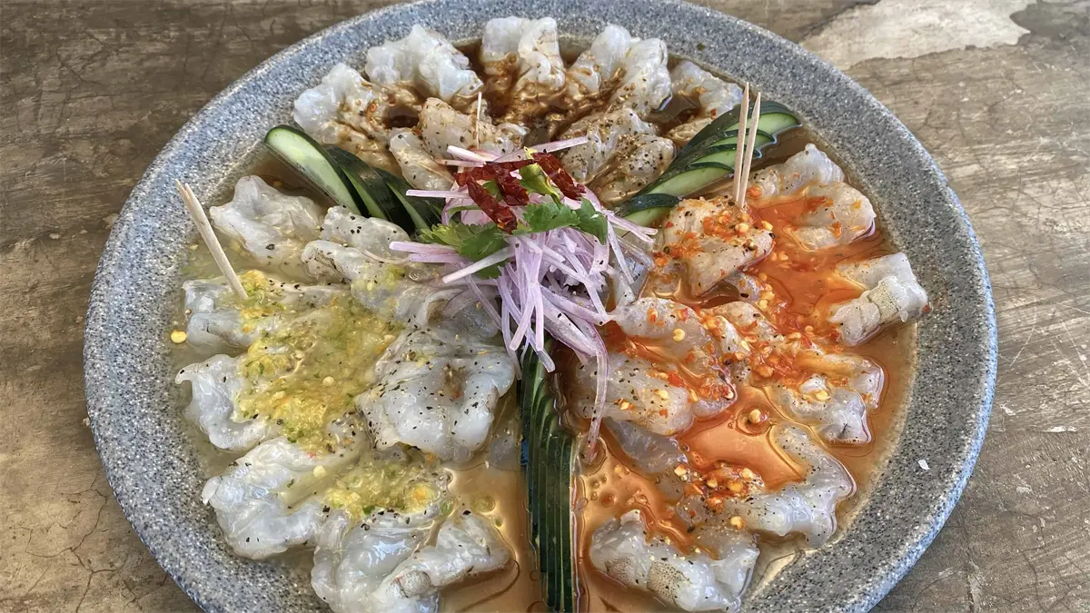 Y el chef Adán Toledo no se quiso quedar atrás, preparando esta combinación de camarón crudo, limón, pepino, cebolla lo más picante posible, bautizándolo como «aguachile tres chiles».