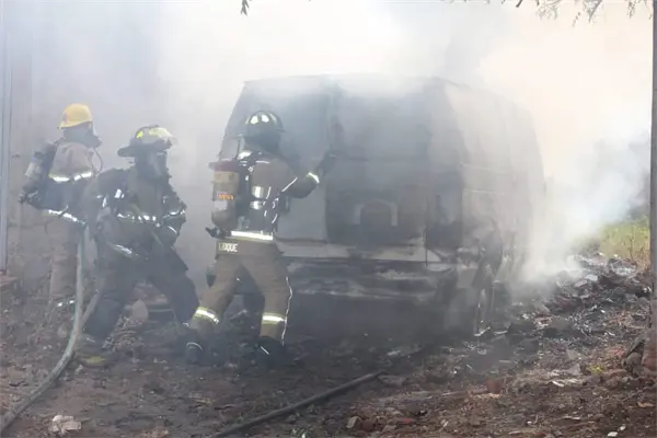 Un fuerte incendio se generó a raíz de una falla eléctrica en una camioneta de modelo antiguo en el fraccionamiento Jacarandas, junto al arroyo Jabalines, esta tarde en Mazatlán.