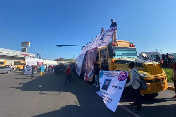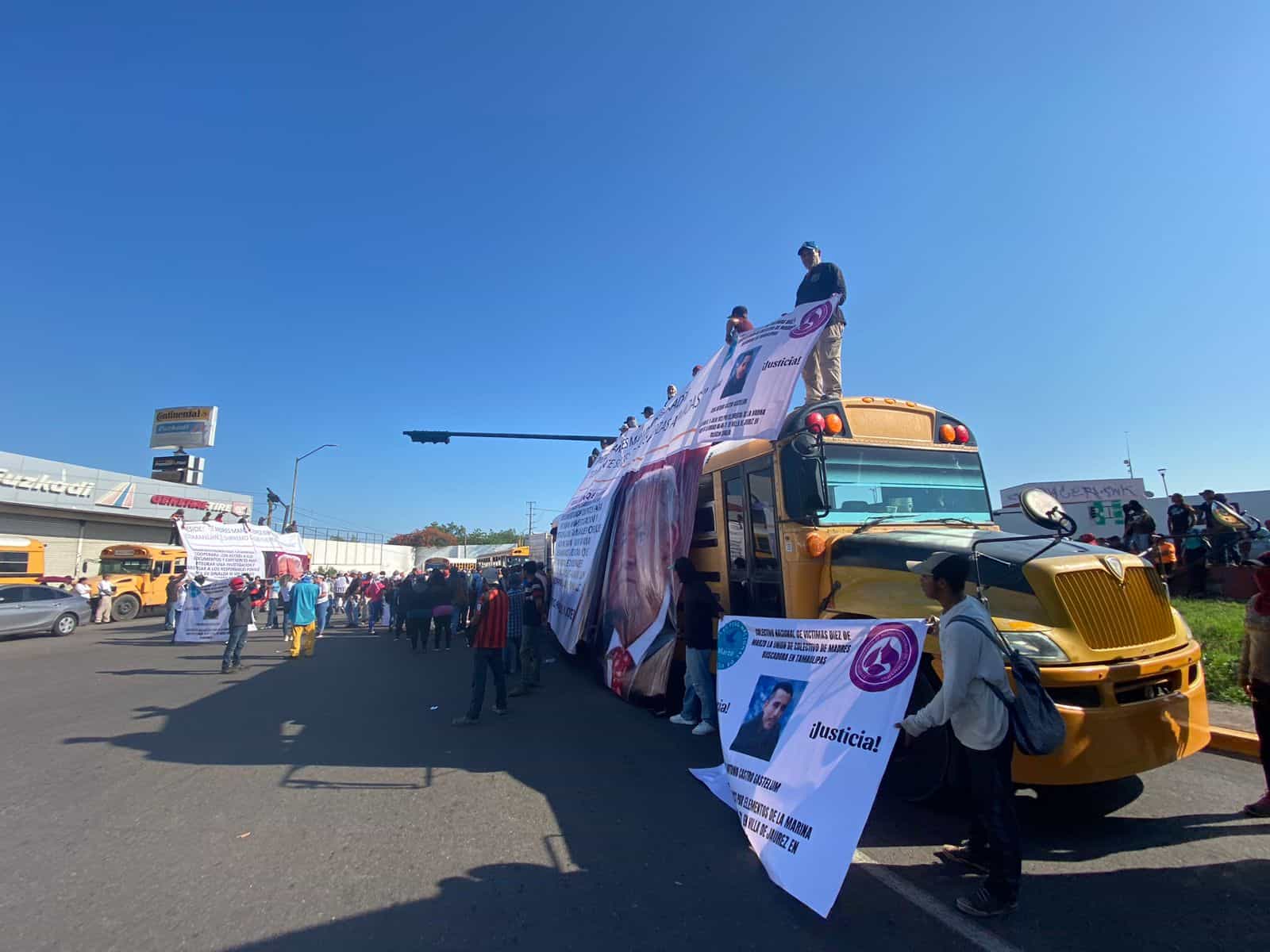 Con camiones y carteles, jornaleros y familiares de personas desaparecidas de Villa Juárez cierran la avenida Insurgentes, en Culiacán, por presunto abuso de autoridad por parte de la Marina.