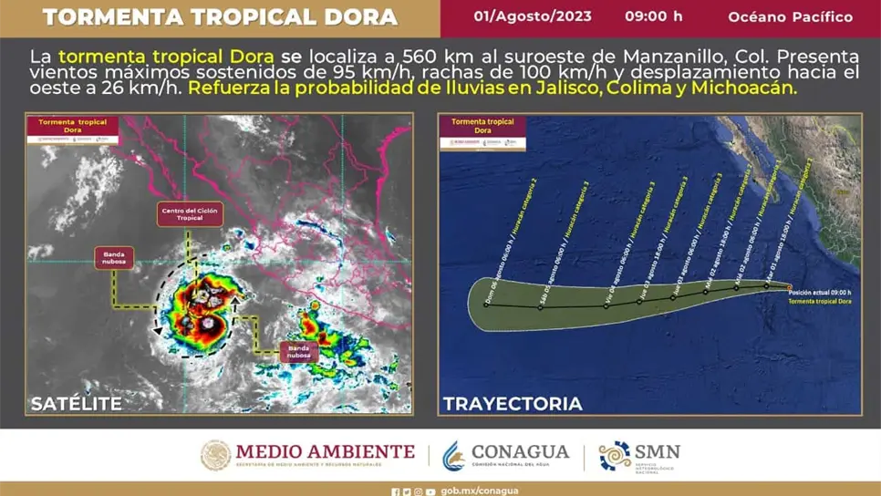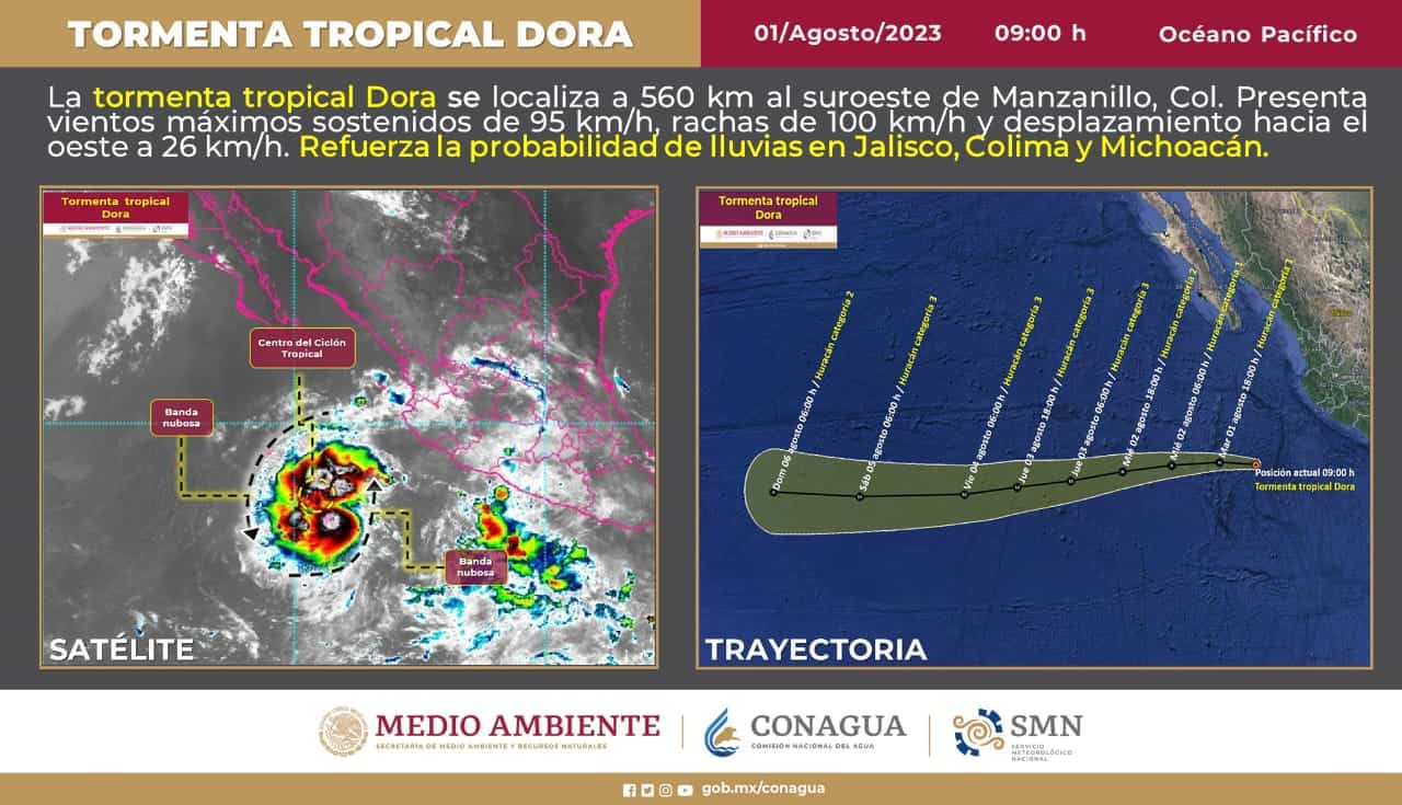 La Comisión Nacional del Agua reveló que «Dora» tiene una trayectoria rumbo a aguas profundas donde seguirá fortaleciéndose hasta ser huracán categoría 2 el miércoles 2 de agosto.