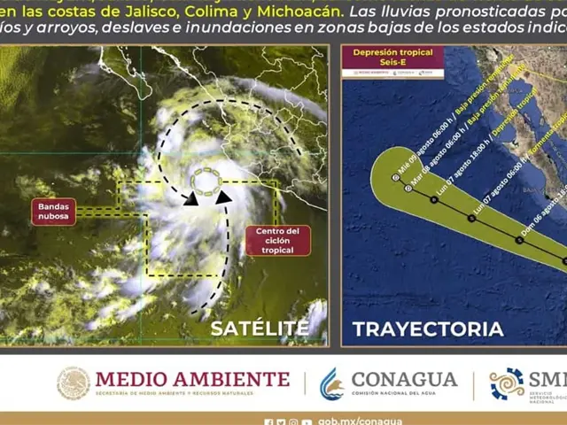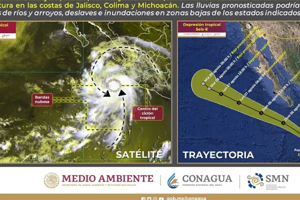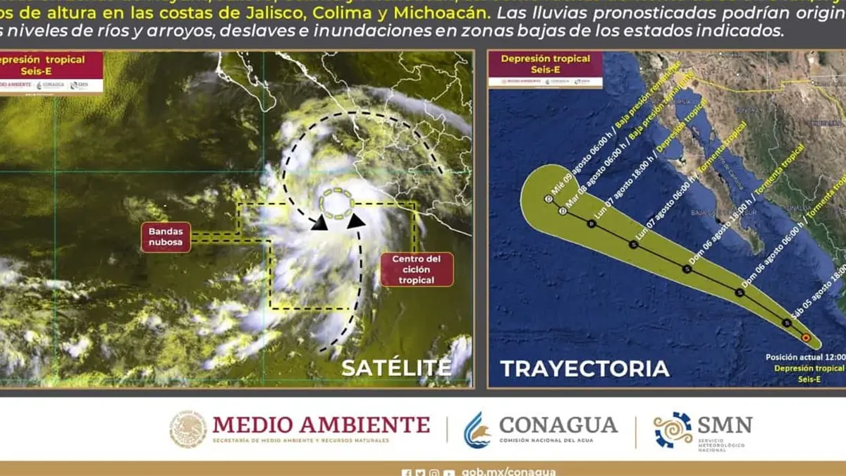 La Depresión Tropical Seis-E tiene una amplia circulación por qué absorbió a la onda tropical Núm. 18, lo que estará generando condiciones que propiciarán lluvias muy fuertes a puntuales intensas con descargas eléctricas en zonas de Nayarit, Jalisco, Colima y Michoacán.
