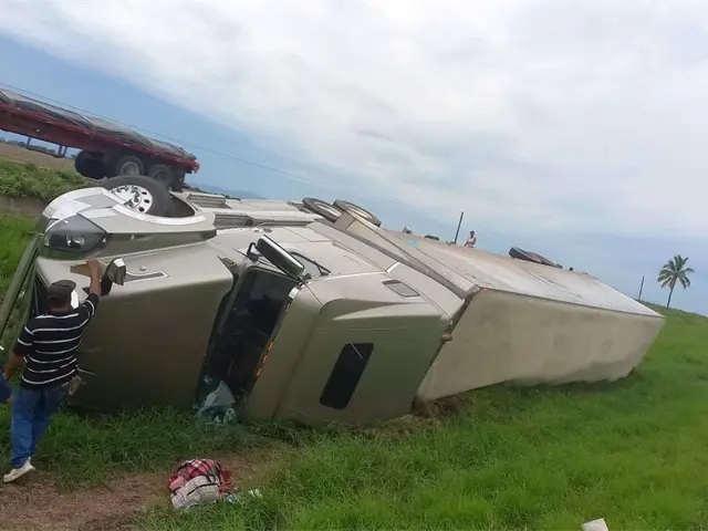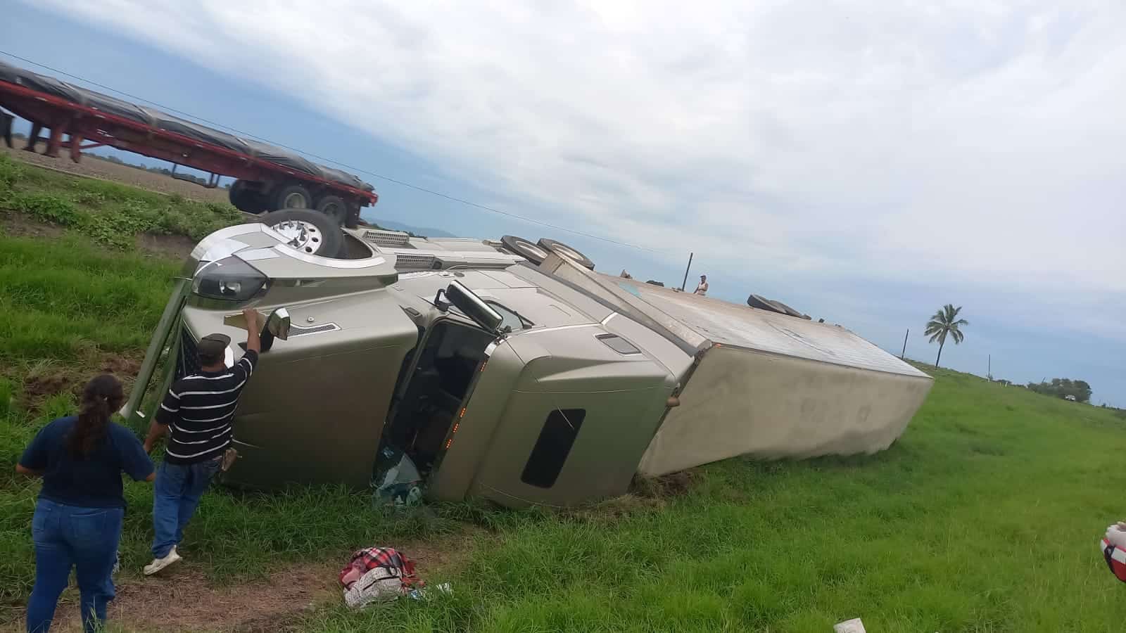 Las autoridades señalaron que solo se reportaron daños materiales. El tráiler accidentado es un camión tipo Volvo de color dorado con caja metálica.