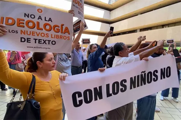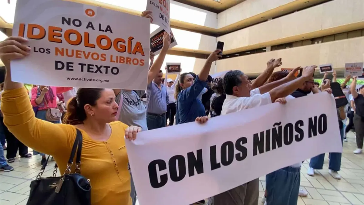 Un grupo de padres de familia se manifestaron en la explanada de Palacio de Gobierno en contra de la distribución de los nuevos libros de texto y del contenido educativo que sus hijos recibirán en el nuevo ciclo escolar.